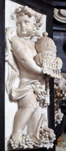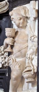 Four semi-elevated white reliefs with small angels stand out against the black marble frame provided by the two column bases. Each of these angels personifies one of the three theological virtues, here connected with the sacrament of the Eucharist. Exceptionally, the angels’ biblical order is respected, thus denying Love its traditional place of honour. Two of the angels have been given butterfly wings instead of bird feathers.