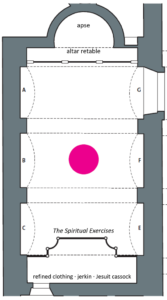 The stone barrel vaulting makes clear that the chapel is devoted to the holy founder of the Company of Jesus, FatherPriest who is a member of a religious order. Ignatius: “S. P. IGN. DE LOYOLA SOCIETATIS JESU FUNDATORI” [Sancto Patri Ignatio]. In the centre Jesus’ monogram, surrounded by sunbeams and the symbols of the four evangelists, makes clear who is the most important one in the Company. At the side of the altar one can read the motto of the order on a banderol: “AD MAJOREM DEI GLORIAM” (To the greater glory of God).