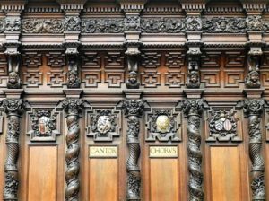 The coats of arms in the panelled backs belong to persons or authorities that paid for the cost of a seat including the Town of Antwerp and the Margrave of Antwerp.