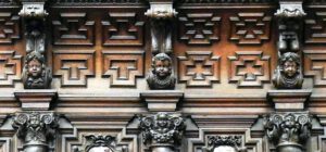 The urge for witticism becomes clear in the many tens of masklike decorations that have been worked into partitions, handles, capitals, friezes and cartouches. There are also innumerable figurative representations. The birds like eating fruit growing on twigs and vines. Often animals quarrel among their own sort, or with snakes and monsters. When looking at the friezes you may find yourself all of a sudden face to face with strange scenes, such as an owl with four young, praying putti, a blessing Christ or God the Father in a Roman outfit, an angel playing music and accompanying two singing colleagues.