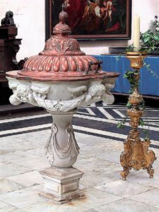 , at the south side. Among those who were baptised here, we may recognize several Belgian authors: Hendrik Conscience (baptised in 1812), the man ‘who taught his people to read’ because he was the first to write really popular books in Flemish, and the novelist Lode Zielens (baptised in 1901). During the 1880’s , baptismThrough this sacrament, a person becomes a member of the Church community of faith. The core of the event is a ritual washing, which is usually limited to sprinkling the head with water. Traditionally baptism is administered by a priest, but nowadays it is often also done by a deacon. was administered to more than a thousand new-borns on average per year, equalling around 2.5% of the population! Since the church’s restoration in 1970-1975, the font has been in the choirIn a church with a cruciform floor plan, the part of the church that lies on the side of the nave opposite to the transept. The main altar is in the choir.; this move echoes the teachings of the Second Vatican CouncilA large meeting of ecclesiastical office holders, mainly bishops, presided by the pope, to make decisions concerning faith, church customs, etc. A council is usually named after the place where it was held. Examples: the Council of Trent [1645-1653] and the Second Vatican Council [1962-1965], which is also the last council for the time being. (1962-1965), which focused on the community receiving the newly-baptised.