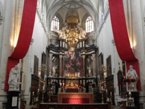 Cette église n’a pas subi de changements radicaux au cours de l' »iconoclasme » qui a suivi Vatican II : pas de démolition ni de vente d’œuvres d’art qui font tellement partie intégrante du bâtiment et qui sont si intimement liées aux expressions de la foi de générations de paroissiens. Il était entendu que rien ne pouvait leur être enlevé sans faire une injustice à l’église. Tout ce qui avait été sauvé après l’invasion française à la fin du 18e siècle n’a pas été abandonné à de nouvelles forces destructrices. Dans cette église, il n’est donc pas nécessaire de « restaurer » ce qui a été perdu dans les années 1960 par « surenchère ». L’accent a été mis sur le renouvellement de la liturgie tel que prescrit par Vatican II. L’utilisation de nouveaux vêtements moins voyants va dans ce sens.