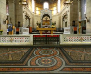 Malgré la richesse de son ornementation, l’église rayonne d’austérité et de paix. La décoration intérieure est hautement symbolique. Tout est un ensemble grandiose : les énormes colonnes monolithiques polies, les exquises mosaïques dorées et le saisissant plafond à caissons. L’autel principal est un ciboire richement décoré, la chaire et les confessionnaux sont en marbre blanc de Carrare et autres marbres précieux. Les carrés dorés qui recouvrent entièrement la nouvelle table d’autel forment une unité stylistique avec les magnifiques colonnes dorées en mosaïque de l’abside.