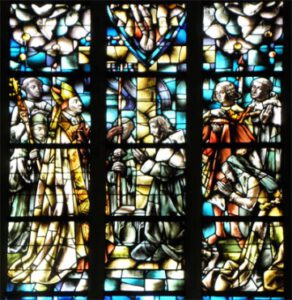 Admirez le vitrail historique représentant toute une famille de saints : Sainte Begga, son père Pippin Ier l’Ancien et sa mère Sainte Ida, son beau-père Saint Arnulfus de Metz et sa sœur Sainte Gertrudis de Nivelles.