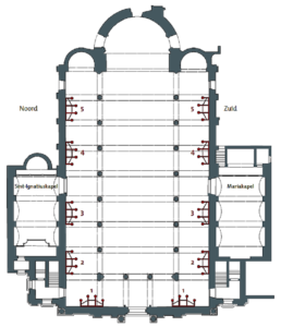 Le grand nombre de confessionnauxMeuble spécialement conçu pour faciliter le sacrement de la confession, notamment en évitant que le confesseur et le confessant se retrouvent face à face. À gauche et à droite il y a des bancs où le confessant s’agenouille ; au milieu il y a une petite cabine où le confesseur s’assoit. Les deux sont séparés par un grillage, de sorte que le confesseur entend le confessant, mais ne le voit pas. dans cette église de PèresPrêtre qui est membre d’un ordre religieux. répond à un besoin. En effet, la foule venant se confesser est telle (au temps pascal près de 4000 pénitents par jour) qu’aux 16 confessionnaux du rez-de-chaussée en ont été ajoutés à la galerie 6 autres réservés aux hommes. Si ce qu’ils ont à confesser ne supporte pas le grand jour, les gens préfèrent les avouer anonymement à l’un ou l’autre Père plutôt qu’à leur curéUn prêtre en charge d’une paroisse. familier. Les confessionnaux des nefs latérales, attribués à Jan Pieter Van Baurscheit l’Ancien (vers 1720), font partie des lambris. Ils étaient au nombre de dix à l’origine, actuellement il y en a encore huit, dont six sont originaux (et un encore toujours utilisé).