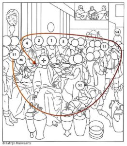 Jezus (✛), nagenoeg centraal in de compositie, valt des te meer op met de felrode mantel. Hij wijst naar de waterkruiken van het Joodse reinigingsgebruik, die, hier ‘zes’ in getal, over bijna de gehele breedte van het voorplan opgesteld staan. Hij maant een dienaar aan ze opnieuw te vullen. Ze deden ze vol water, tot de rand toe (v. 7).