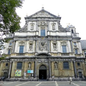 Het ontwerp gaat terug op architect, fysicus, mathematicus Francisco Aguilon, van Spaanse afkomst (1567-1617), opgevolgd door jezuïet Pieter Huyssens (1577-1637). De buste van Ignatius siert bovenaan de gevel. Zijn leven en dat van zijn metgezel Franciscus Xaverius wordt uitgebeeld op de basreliëfs in de zijbeuken; beide heiligen hebben hun sculptuur aan het hoofdaltaar (werk van Artus Quellinus I uit 1656-1658).