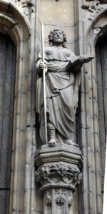 - Levensgroot, in steen, op het penant van het hoofdportaal, gebeeldhouwd door J.L. Jacobin (1921). Een grote sint-jacobsschelp fungeert als baldakijnaureool.