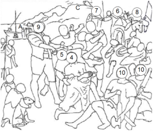Jezus’ antwoord is tweevoudig. Het bekomen van eeuwig geluk voor een mens hangt af van God: “voor wie mijn Vader dit heeft bereid” (v.23); vandaar Jezus’ rechtervinger opwaarts ten hemel. En ten tweede: ware grootheid bestaat er in dat je anderen dient (v.26-28).